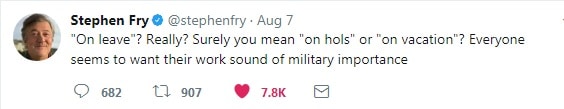 Recently on Twitter, the actor and broadcaster Stephen Fry, questioned the use of the word leave when used referring to a holiday (or hols as he puts it).