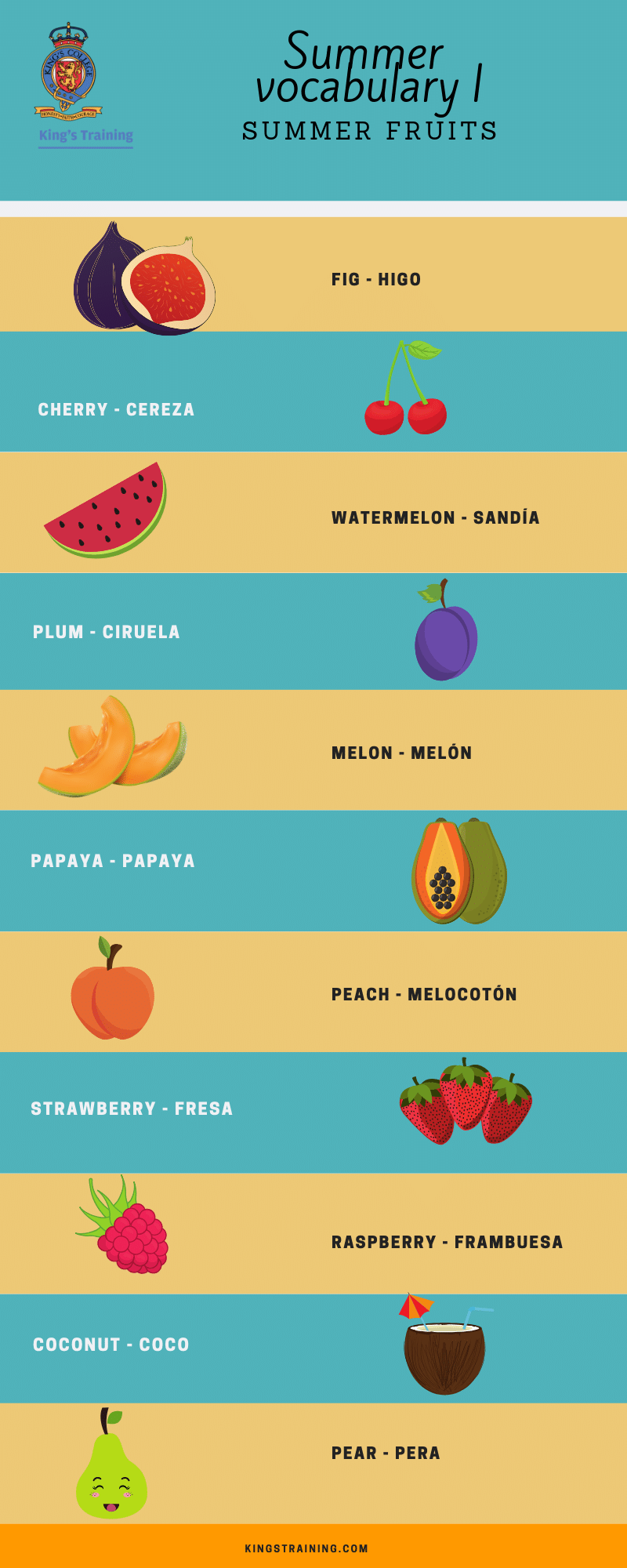 Nos encanta el verano, es la época de las vacaciones, el mar, la playa, las terrazas….y también la mejor época para seguir practicando el inglés, ya sea con un viaje a algún país de habla inglesa, con algún curso intensivo o si no tienes tanto tiempo, con nuestra infografías veraniegas que os iremos regalando a partir de hoy. Empezamos con un tema muy yummy!!: Summer fruits!! ¿Cuál es tu favorita? ¡Feliz verano!