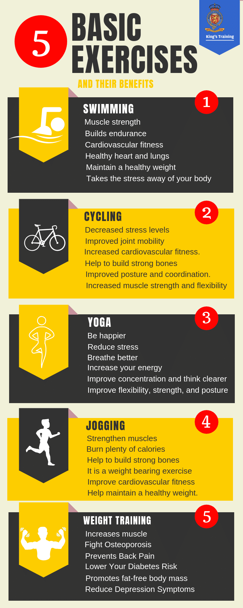 Nunca es tarde para comenzar a mejorar tus hábitos y cambiar tu estilo de vida, en esta infografía te contamos cuales son los 5 ejercicios más importantes que debes tener en cuenta para crear tu rutina de ejercicios.